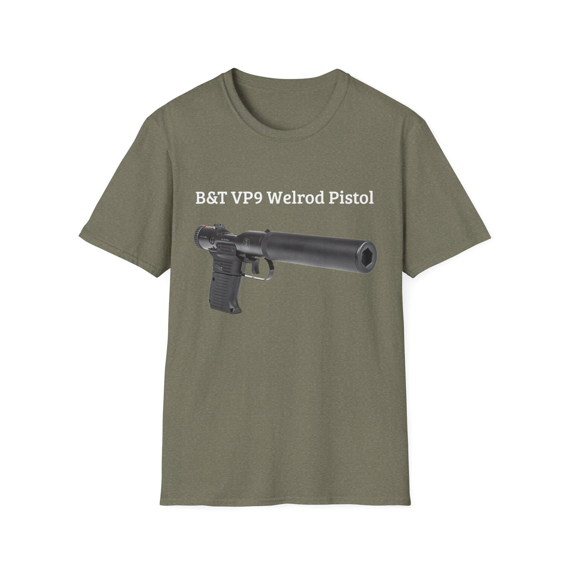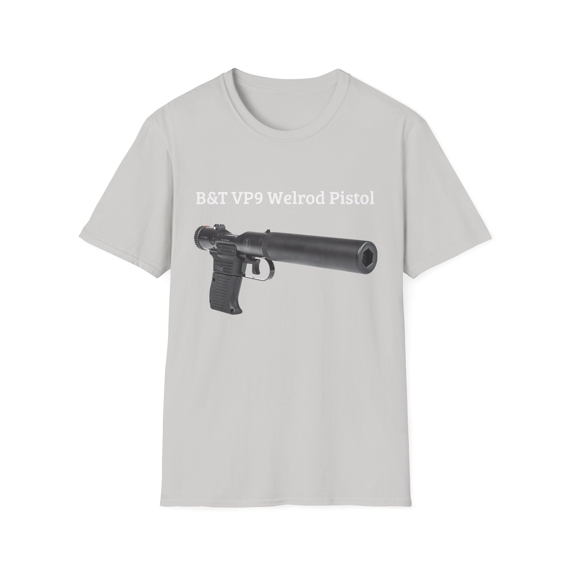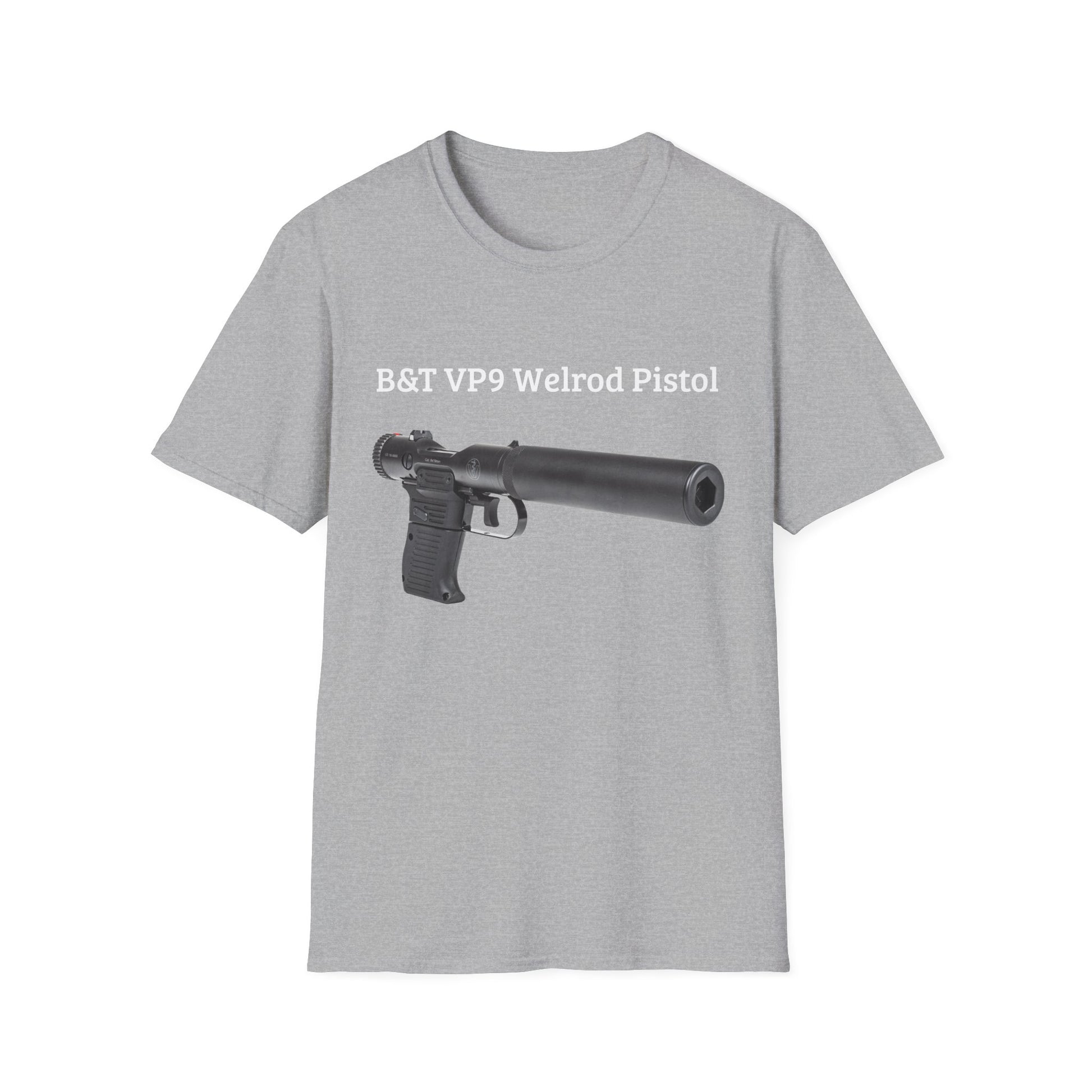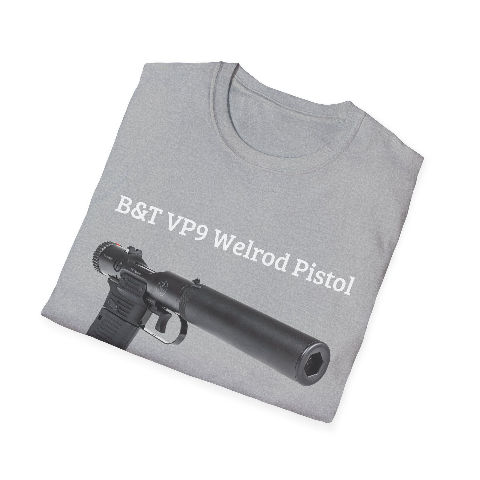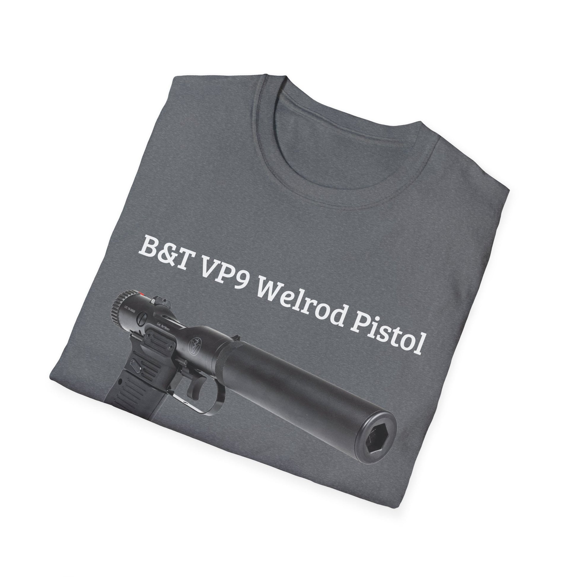 .: Fabric blends: Heather colors - 35% ring-spun cotton, 65% polyester; Sport Grey and Antique colors - 90% cotton, 10% polyester, Graphite Heather - 50% ring-spun cotton, 50% polyester B&T VP9 Welrod Pistol Unisex Softstyle T-Shirt