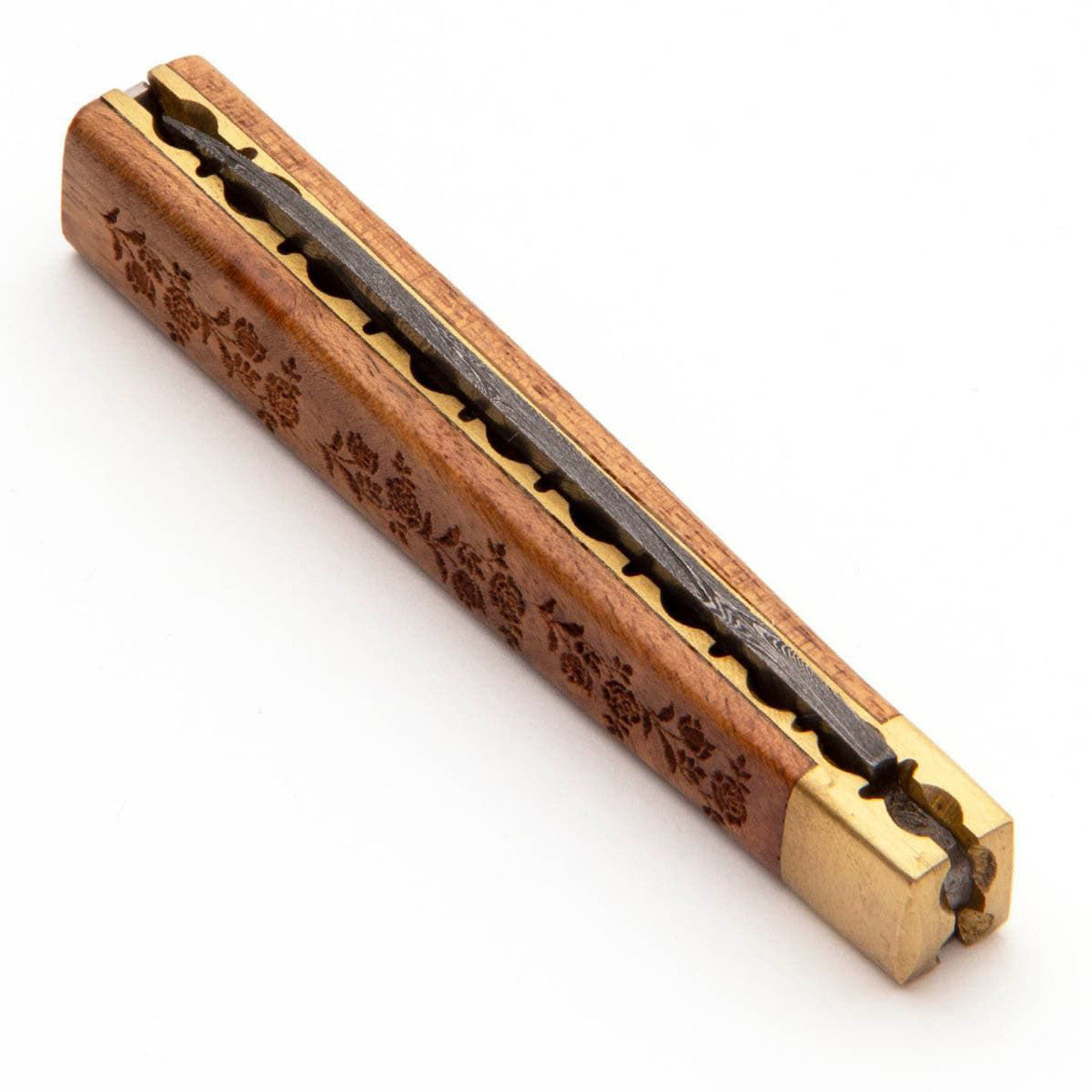 This 1800s doctors knife design was used for cutting, counting, and crushing pills. This one is a little fancy, too, befitting a gentleman doctor of the period. This pocket knife has a nice Damascus blade, the brass liners have integral bolsters and are jimped all the way around, so this knife has no "worst side". The clover wood scales are laser filigreed with a spray of roses.
