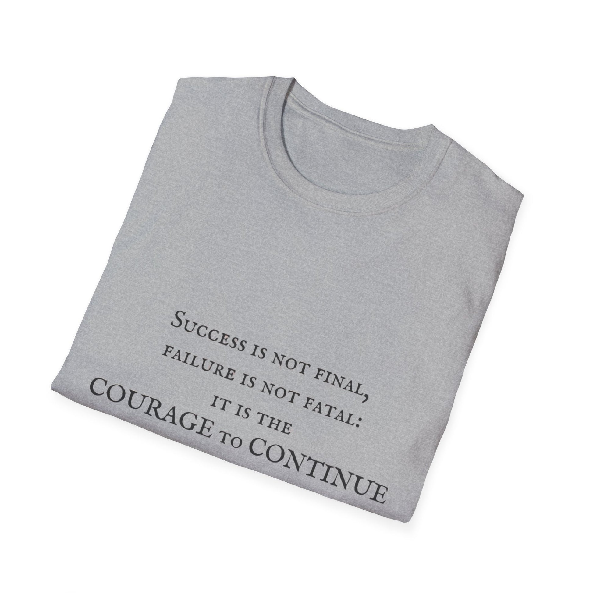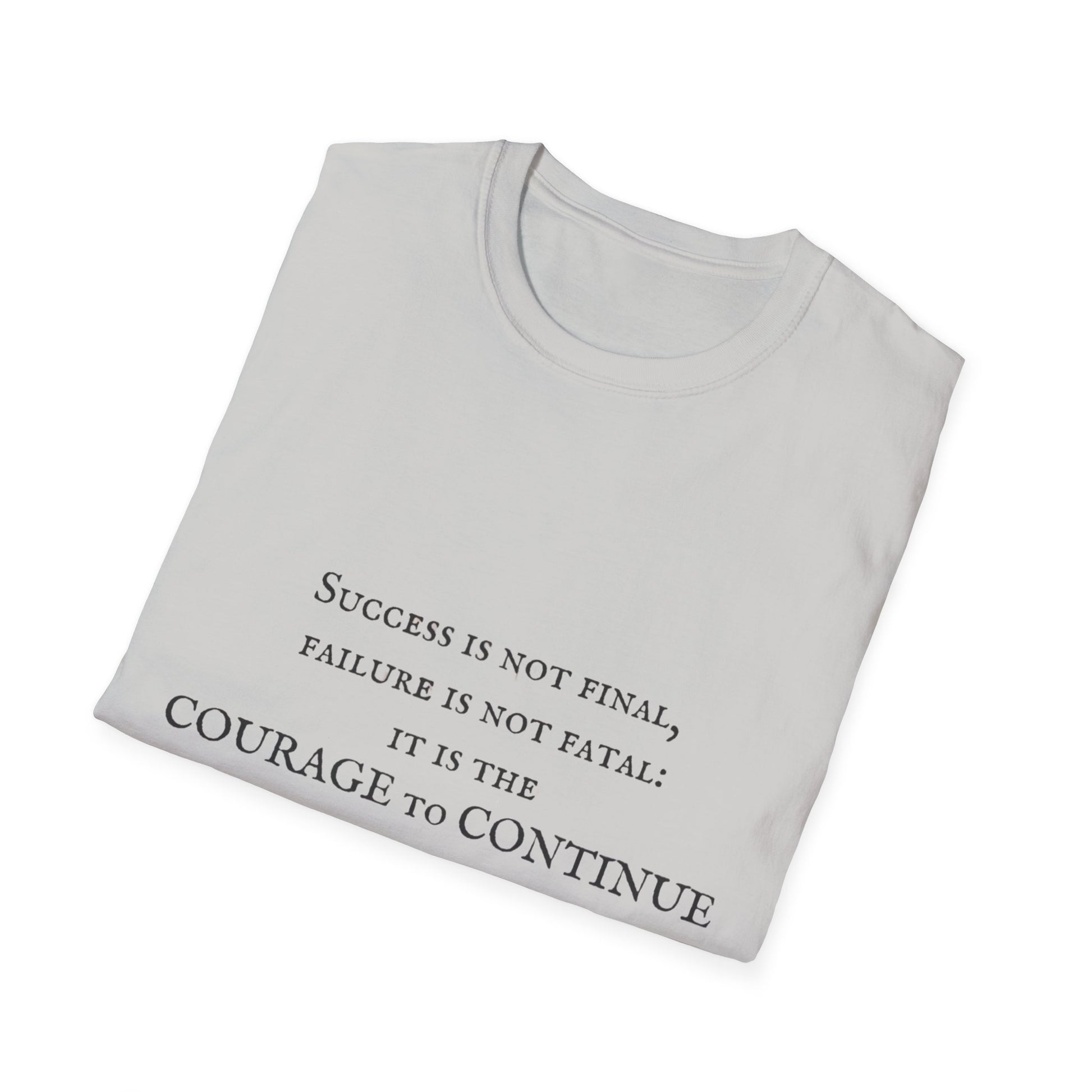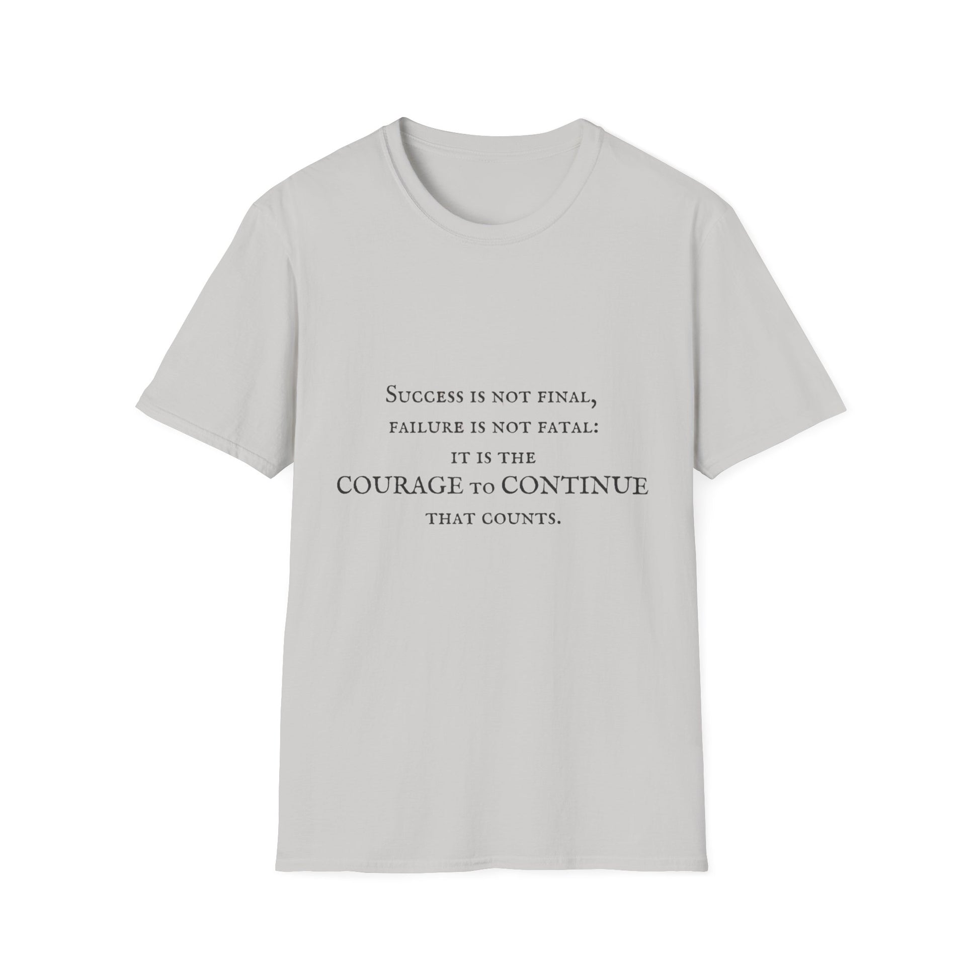 A motivational and inspiring unisex T-Shirt featuring the quote 'Success is not final, failure is not fatal: it is the courage to continue that counts'. Made from 100% ring-spun cotton, this lightweight fabric ensures comfort all year round. The classic fit with a crew neckline offers a versatile style suitable for any occasion, formal or semi-formal. Perfect for adults looking for a durable and smooth fabric T-shirt with ethical and sustainable production.