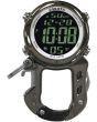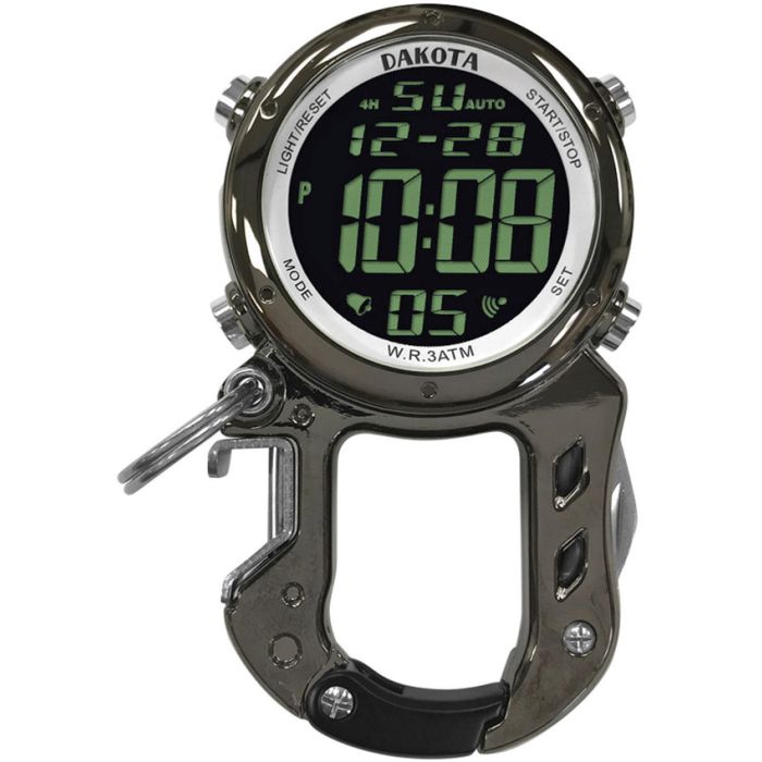 Reverse digital E.L. Dial. Polished gunmetal case. 100ft water resistant. Moonglow Electro Luminescent dial light. Alloy case. Integrated carabiner clip. Stopwatch. Countdown timer. Dual time. Alarm with chime. Bottle opener. Small blade. Attached split ring. Mineral crystal glass. Stainless case back. Boxed.
