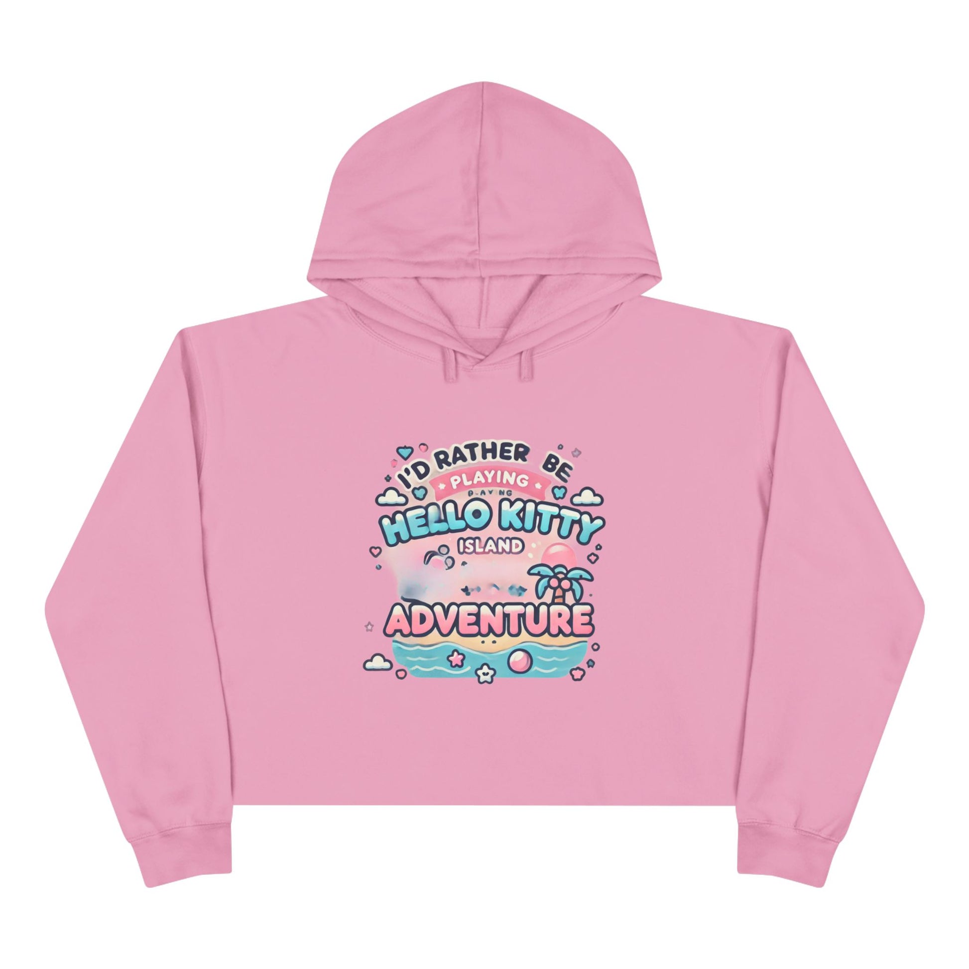 A playful and cute Crop Hoodie featuring 'I’d rather be playing Hello Kitty island adventure' design. This cozy hoodie gives off a fun and whimsical vibe, perfect for those who love Hello Kitty and want to show off their playful side. Ideal for lounging at home, running errands, or casual hangouts with friends. Great for fans of Hello Kitty, relevant for birthdays, casual wear, and fan conventions.