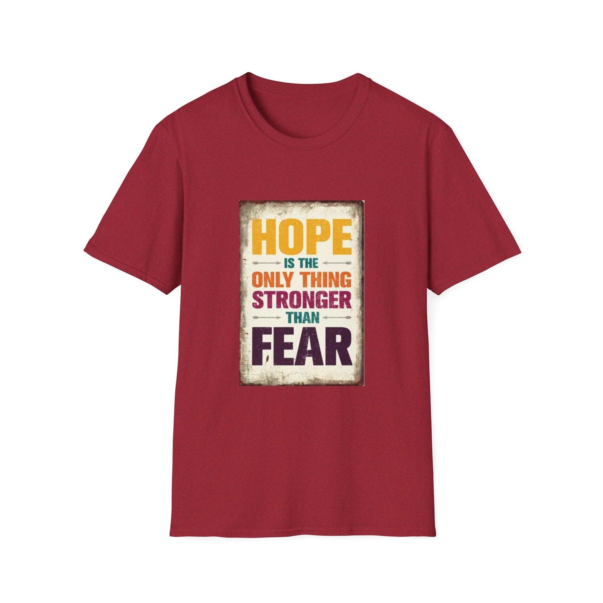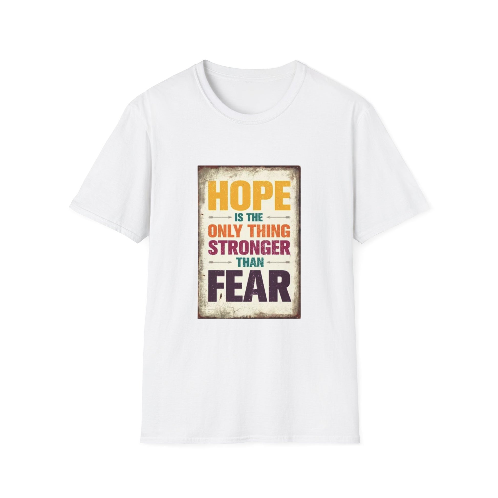 HOPE IS THE ONLY THING STROGER THAN FEAR Unisex Softstyle T-Shirt The unisex soft-style t-shirt puts a new spin on casual comfort. Made from very soft materials, this tee is 100% cotton for solid colors. Heather colors and sports grey include polyester. The shoulders have twill tape for improved durability. There are no side seams. The collar is made with ribbed knitting to prevent curling damage. HOPE IS THE ONLY THING STROGER THAN FEAR Unisex Softstyle T-Shirt