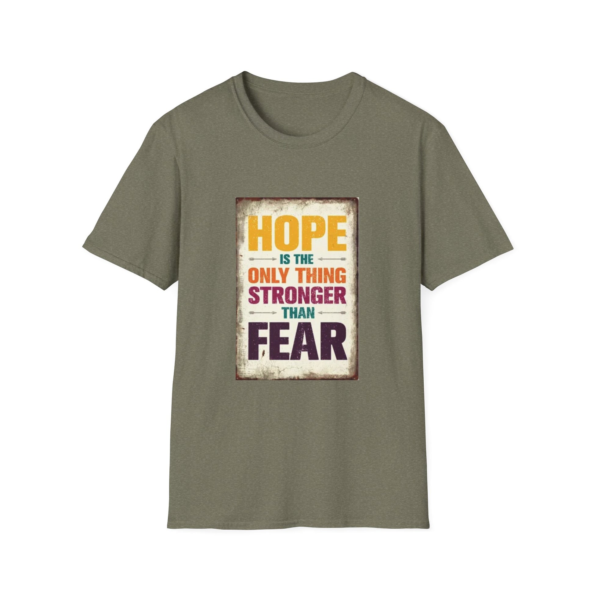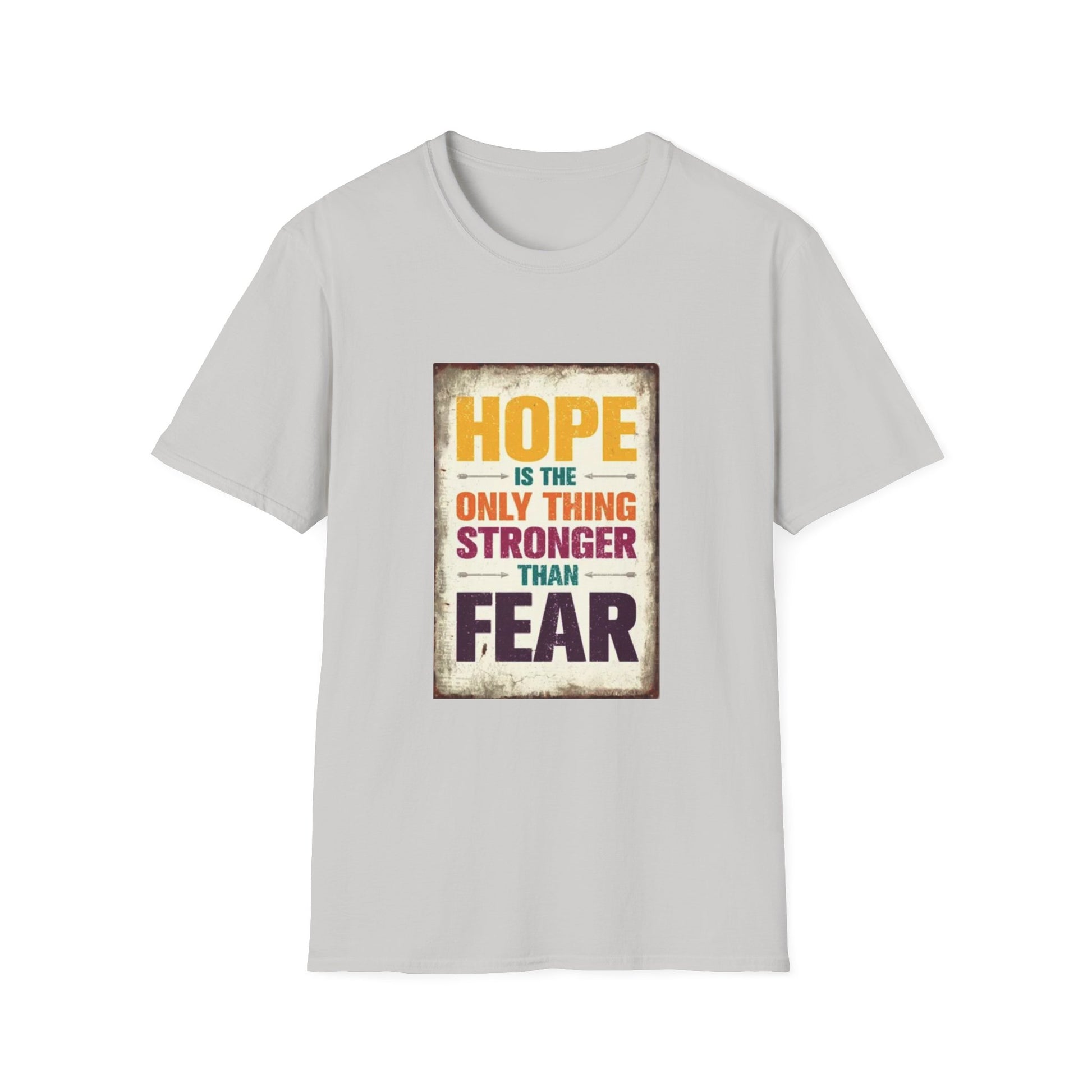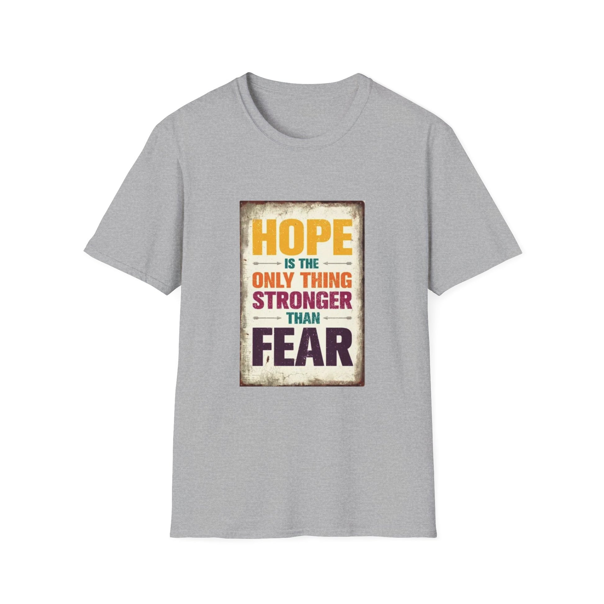 .: Fabric blends: Heather colors - 35% ring-spun cotton, 65% polyester; Sport Grey and Antique colors - 90% cotton, 10% polyester, Graphite Heather - 50% ring-spun cotton, 50% polyester HOPE IS THE ONLY THING STROGER THAN FEAR Unisex Softstyle T-Shirt