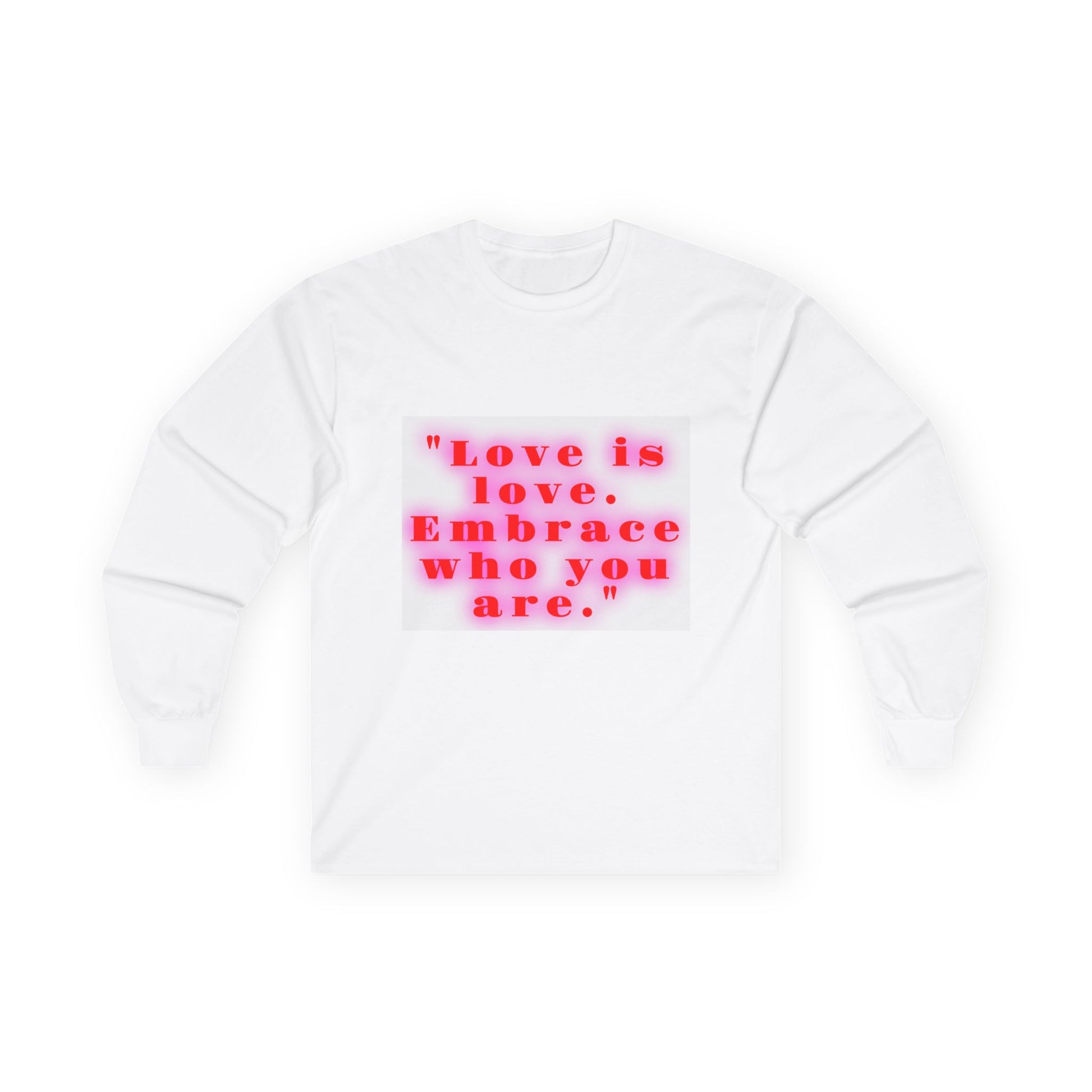 This Unisex Ultra Cotton Long Sleeve Tee with the design 'Love is love Embrace who you are' is perfect for members of the LGBTQ+ community. It exudes positivity and acceptance, making it a great addition to someone's wardrobe to show their pride and support. Ideal for Pride Month celebrations, LGBTQ+ events, and everyday wear for those who want to spread a message of love and acceptance.