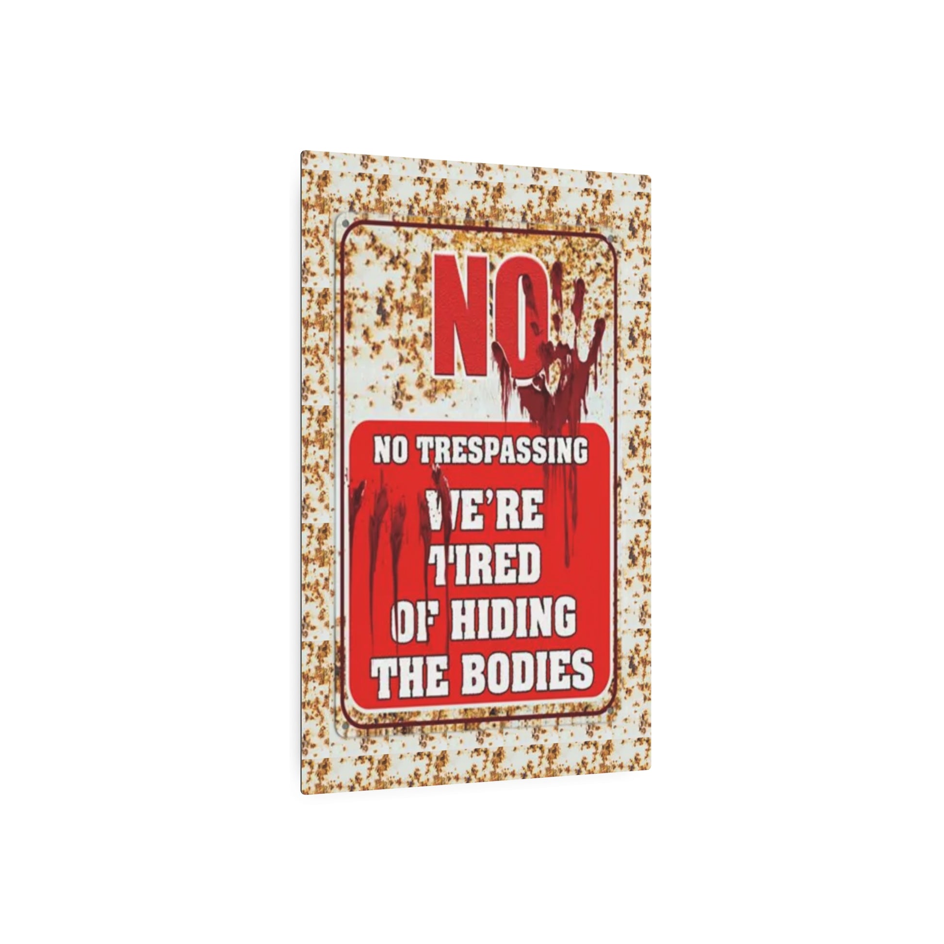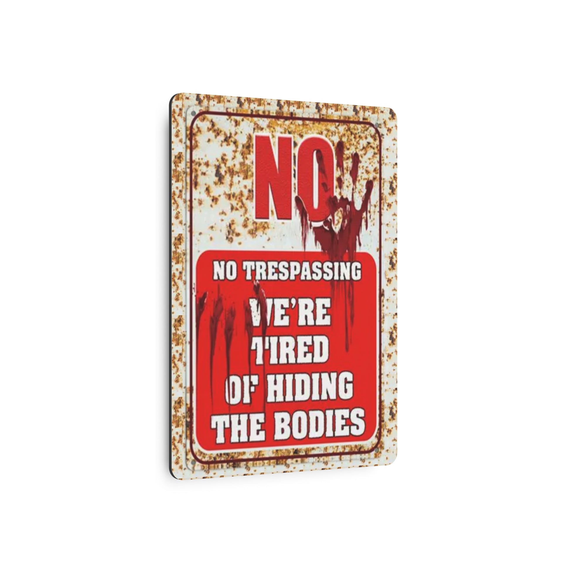 NO TRESPASSING WE'RE TIRED OF HIDING THE BODIES Metal Art Sign Τhese custom metal signs create unique decoration pieces that can be hung anywhere in your home. Made with 3mm white aluminum composite, these custom metal signs come with a beautiful white matte finish. Each sign comes with one mounting block for effortless hanging and is available in 11 sizes.